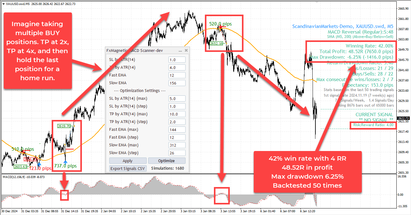 FxMagnetic™ is unique due to its optimization function, comprehensive stats display, and signal outcomes shown directly on the chart. So far, we do not know anything else like this in the market that allows you to discover winning strategies in minutes by running thousands of strategy simulations and finding the best parameters based on informed decisions and history data. Doing this work manually will take ages. This software saves you thousands of hours in manual labor.